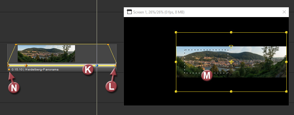 Ziehen Sie das Bild Heidelberg-Panorama in eine Bildspur und verlängern Sie das Objekt auf etwa 15 Sekunden.