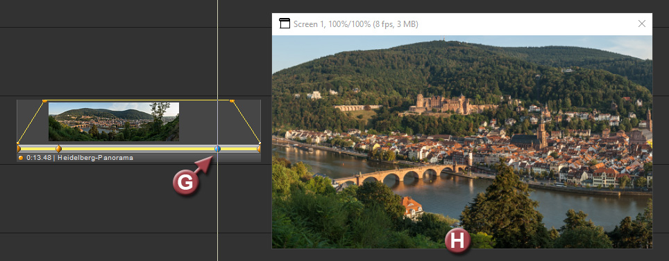 Ziehen Sie das Bild Heidelberg-Panorama erneut in eine Bildspur und halten Sie beim Ablegen des Bildes in die Spur die Tasten Strg + Alt gedrückt. Diese beiden Tasten bewirken, dass automatisch eine Steuerspur mit einem Keyframe erzeugt wird (A) und das Bild formatfüllend im Screen erscheint (B). Verlängern Sie das Bildobjekt auf etwa 15 Sekunden (C). Falls die Dauer in der Info-Zeile des Objekts nicht angezeigt wird, können Sie dies unter Optionen - Globale Optionen - Objekte - Bilder aktivieren.