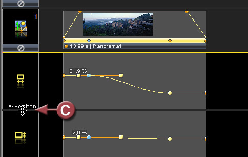 Vergrößern Sie nun die Höhe der Steuerspur für die X-Position. Fassen Sie nun die Trennlinie (C) und ziehen Sie diese nach unten, so dass die Spur gut doppelt so hoch ist und die geschwungene Form der Kurve deutlich wird. Mehr zum Editieren mit Hilfe des Keyframe-Editors finden Sie unter Der Keyframe-Editor.
